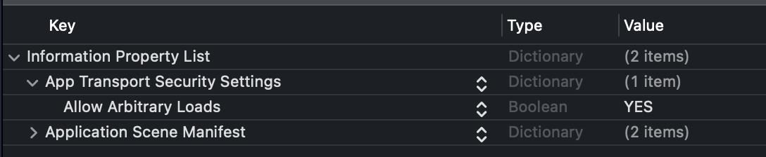 App Transport Security Settings 탭이 아예 존재하지 않는다면, + 버튼을 눌러 추가하면 된다.(Allow Arbitrary Loads도 마찬가지)