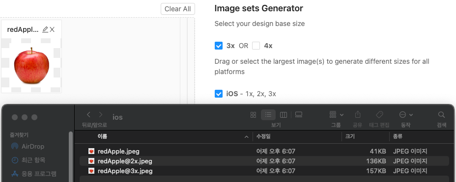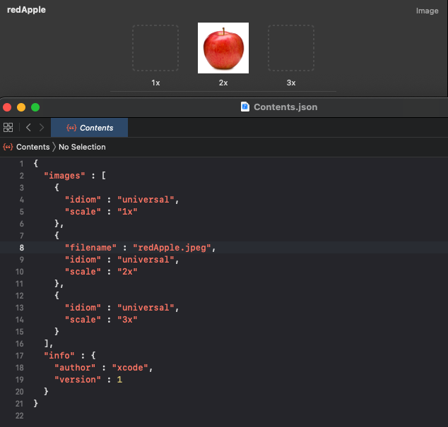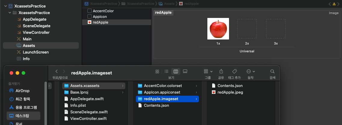 사진에서 Finder를 먼저 보도록 하자. 난 분명 jpeg만 넣었는데, redApple.imageset폴더와 json 파일이 자동으로 생성되었다.