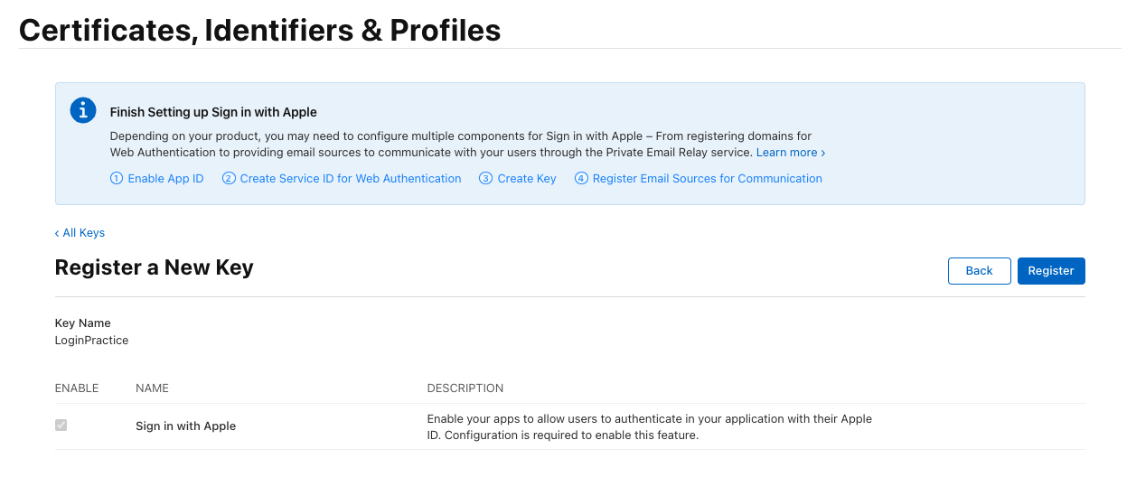 2. Sign in with Apple을 찾고, Register 후 뒤로 돌아간다.