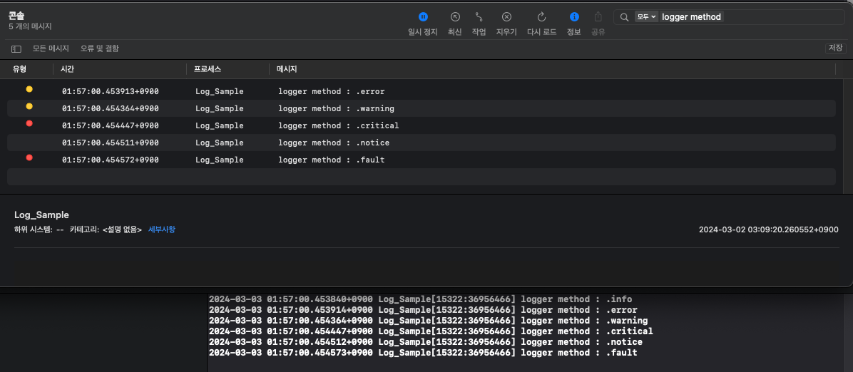 이러면 print문처럼 Xcode에 로그가 찍히면서 console.app에도 로그가 남는다. 사용이 정말 쉽고 편리하다.